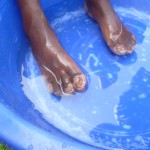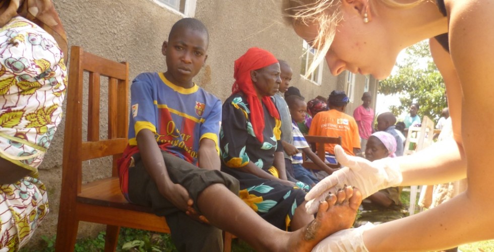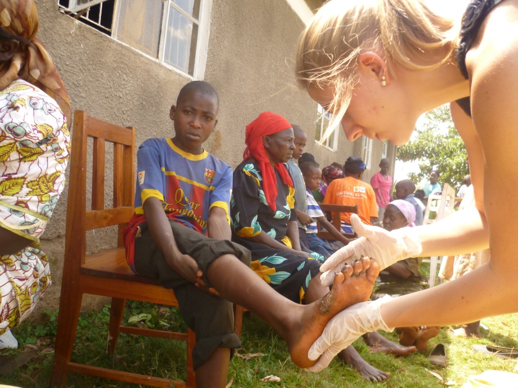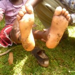 Samstag, den 18. Januar 2014, fand wiederum ein „Jigger – Camp“ in Mbale statt. Jiggers sind Sandflöhe, die sich in die Füße der Menschen fressen und sich dort vermehren. 50 Kinder und Erwachsene aus unserem Projekt kamen, um sich behandeln zu lassen. Einige Frauen wurden inzwischen medizinischen darin geschult, wie Jiggers aus den Füßen entfernen werden: Nachdem die Füße in einem Fußbad desinfiziert wurden, werden die Sandflöhe herausgeschnitten und danach die Wunden mit Salbe behandelt, damit sie schneller heilen. Einige Tage vor dem „Jigger- Camp“ wurden von Recky Awino Kyalo und mir für die Kinder und Erwachsenen neue Schuhe gekauft. Schuhe verhindern, dass sich die Jiggers wieder in die Füße fressen können. Bei dem Auftragen der Salbe und dem Verteilen der Schuhe konnte ich tatkräftig mithelfen. Natürlich fiel es mir nicht leicht, mich an die Anblicke der befallenen Füße und das Entfernen der Sandflöhe zu gewöhnen. Jedes Kind konnte sich im Anschluss an die schmerzhafte Behandlung über ein Paar neue Schuhe freuen. Bei einigen Kindern war der Befall so weit fortgeschritten, dass sie nachträglich noch im Krankenhaus behandelt werden mussten, da es unmöglich war, alle Sandflöhe aus den Füßen zu entfernen.